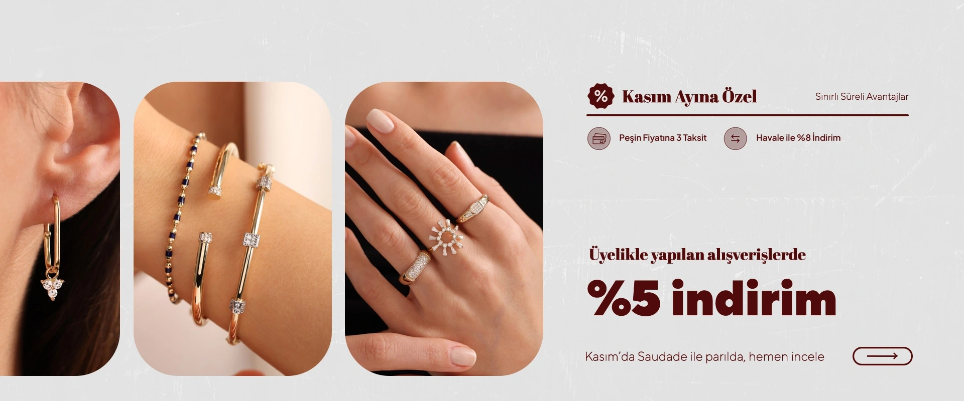 Saudade Jewelry, modern kadının zarafetini ve özgünlüğünü yansıtan, göz alıcı takı koleksiyonlarıyla dikkat çekiyor. Her bir parça, ustalıkla işlenmiş 14 ayar altından üretiliyor ve sizin eşsiz tarzınızı tamamlamak için tasarlanıyor. Minimal tasarımlardan gösterişli parçalara kadar geniş bir yelpazede sunduğumuz koleksiyonlarımızla, her anınızda size eşlik edecek mücevherleri bulacaksınız. Saudade Jewelry'nin her bir tasarımı, yılların deneyimiyle harmanlanan çağdaş estetik anlayışının bir yansıması. Koleksiyonlarımız, günlük hayatın dinamizmine ayak uydurabilen, aynı zamanda özel anlarda sizi ön plana çıkaracak parçalardan oluşuyor. Moda trendlerini yakından takip ederken, zamansız şıklığı da göz ardı etmeyen tasarım felsefemiz, her zevke ve tarza hitap eden geniş bir ürün yelpazesi sunmamızı sağlıyor.